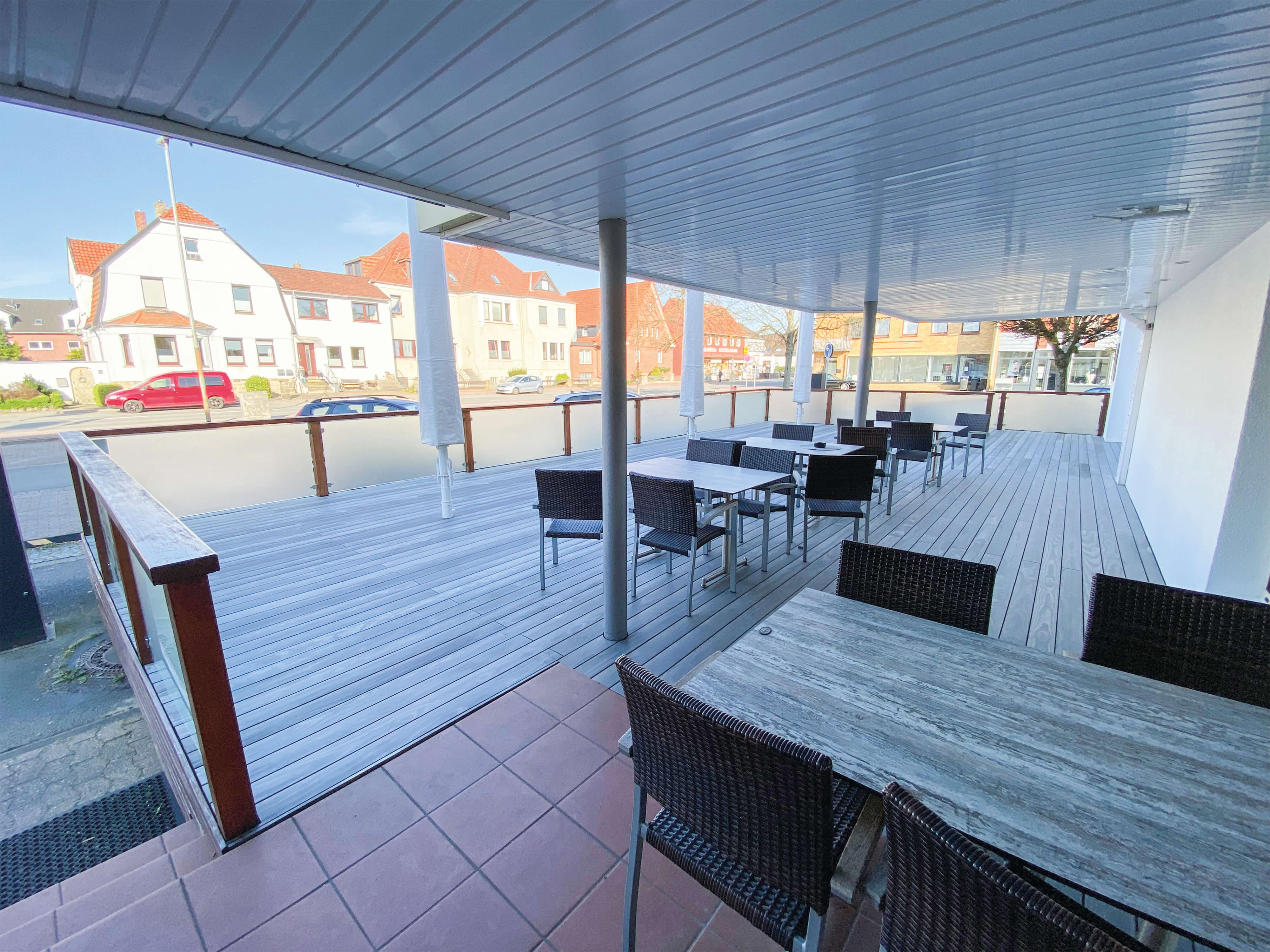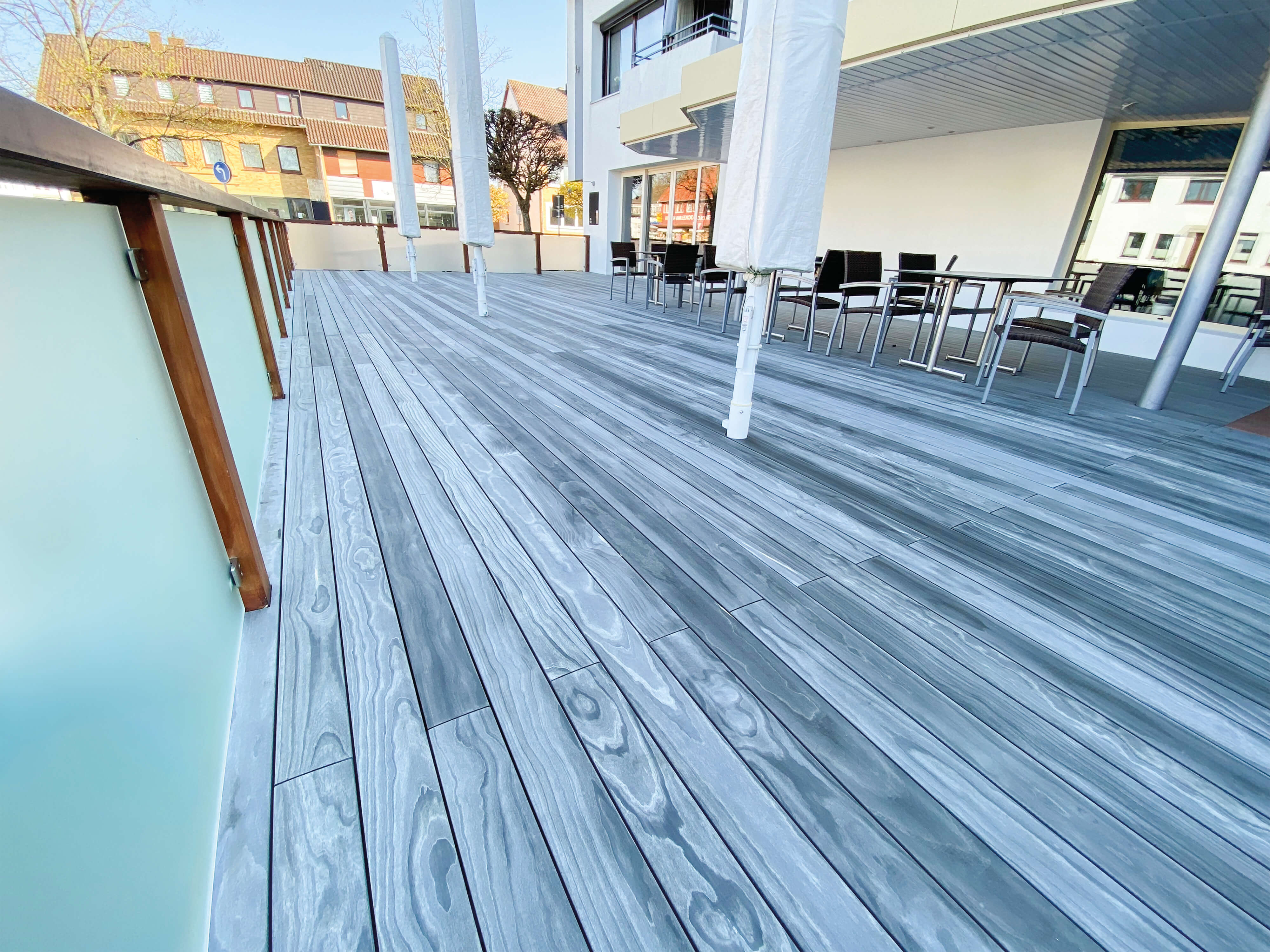 Die Dielen sind bombiert (an der Oberfläche leicht gerundet), damit sichergestellt ist, dass Wasser auch ohne Gefälle gut ablaufen kann.