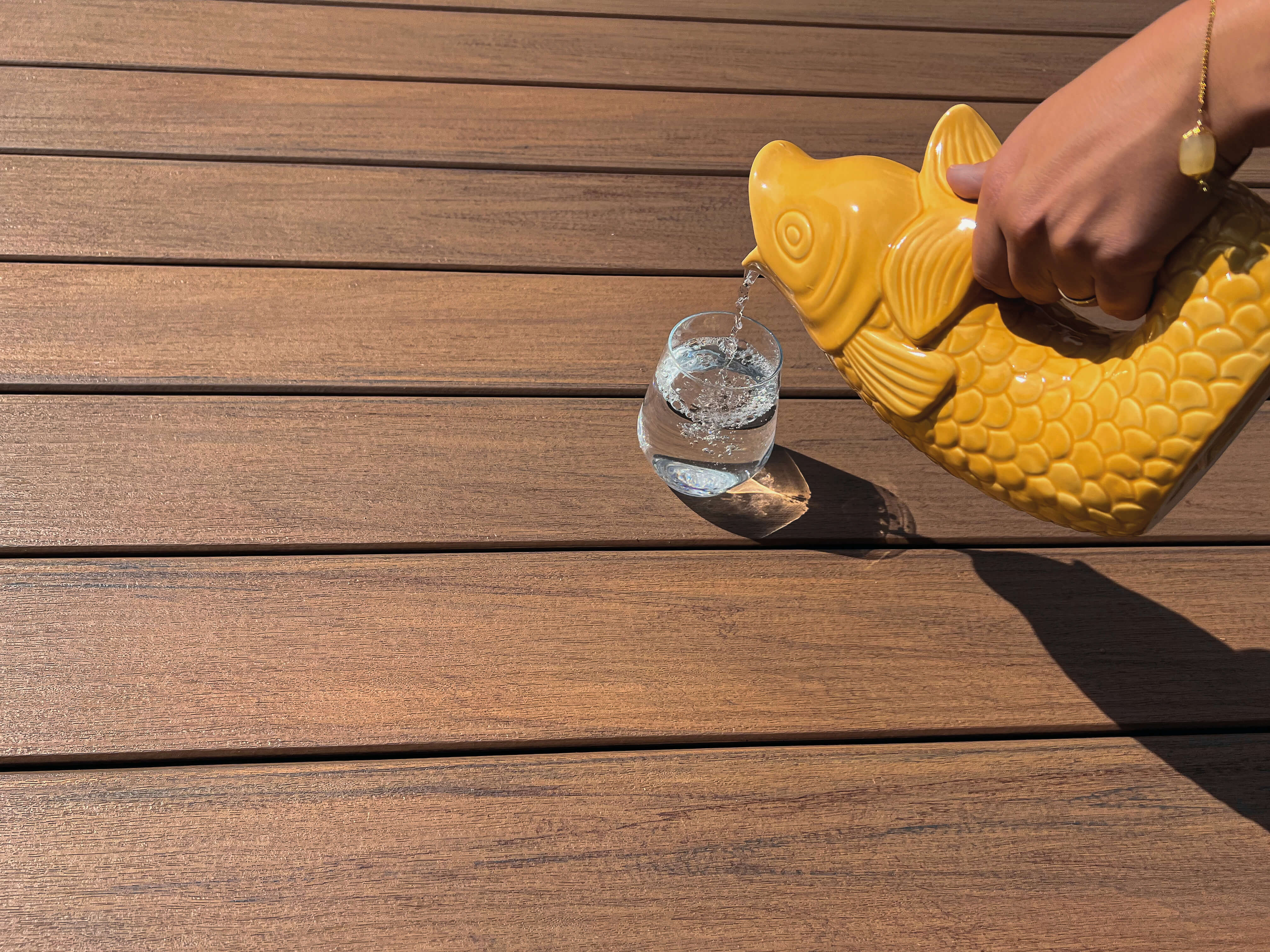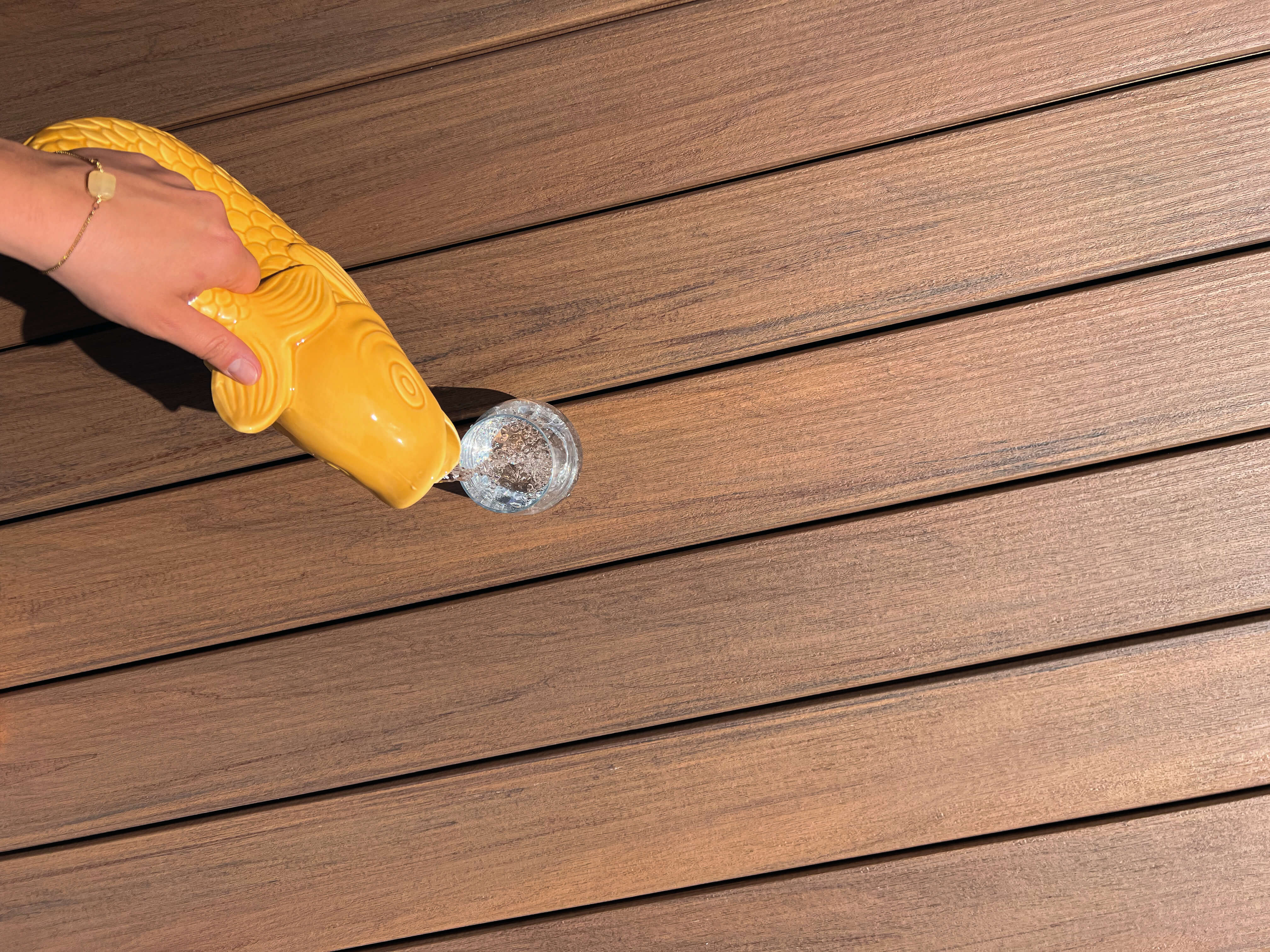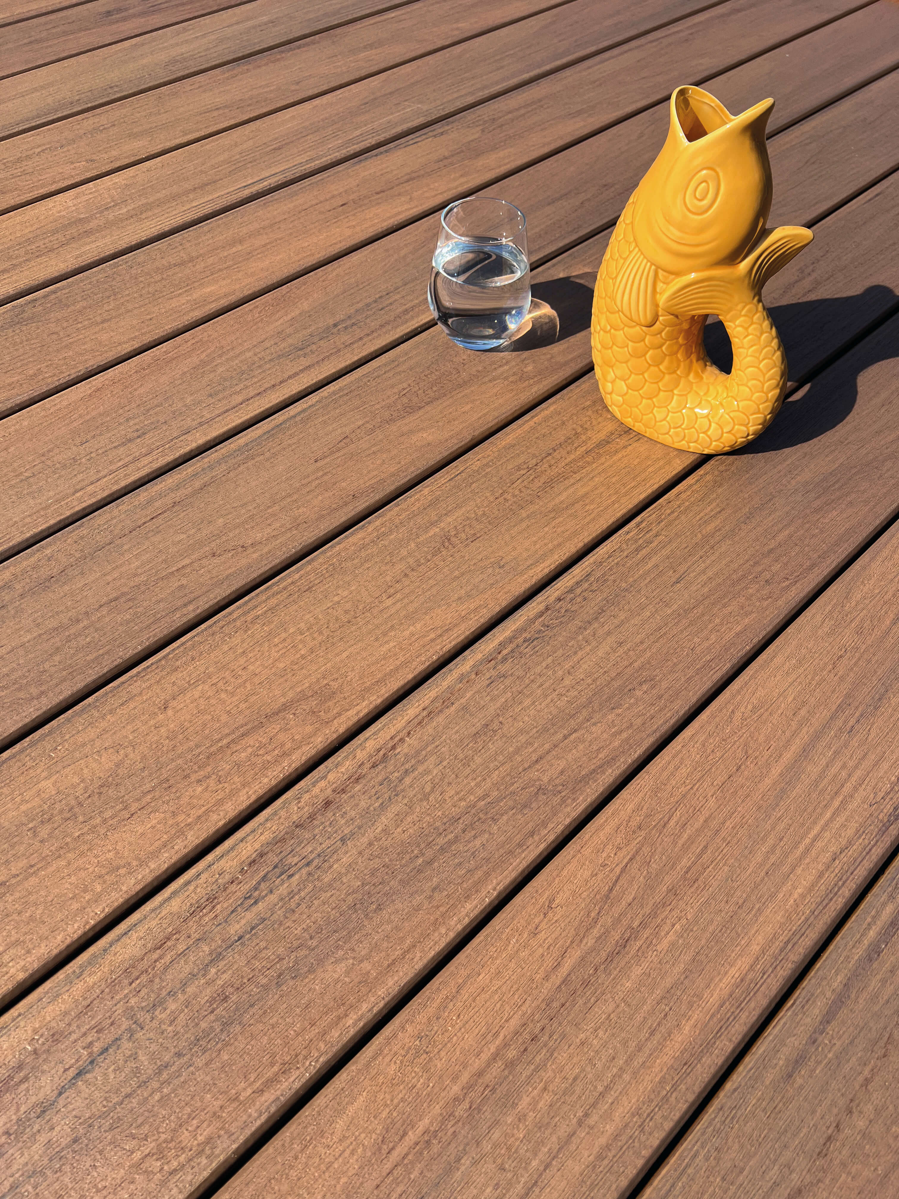Wie bei hochwertigen WPC-Dielen üblich, kann sich die Farbintensität im Laufe der Jahre leicht verändern und etwas aufhellen – ein natürlicher Prozess bei UV-Einwirkung.