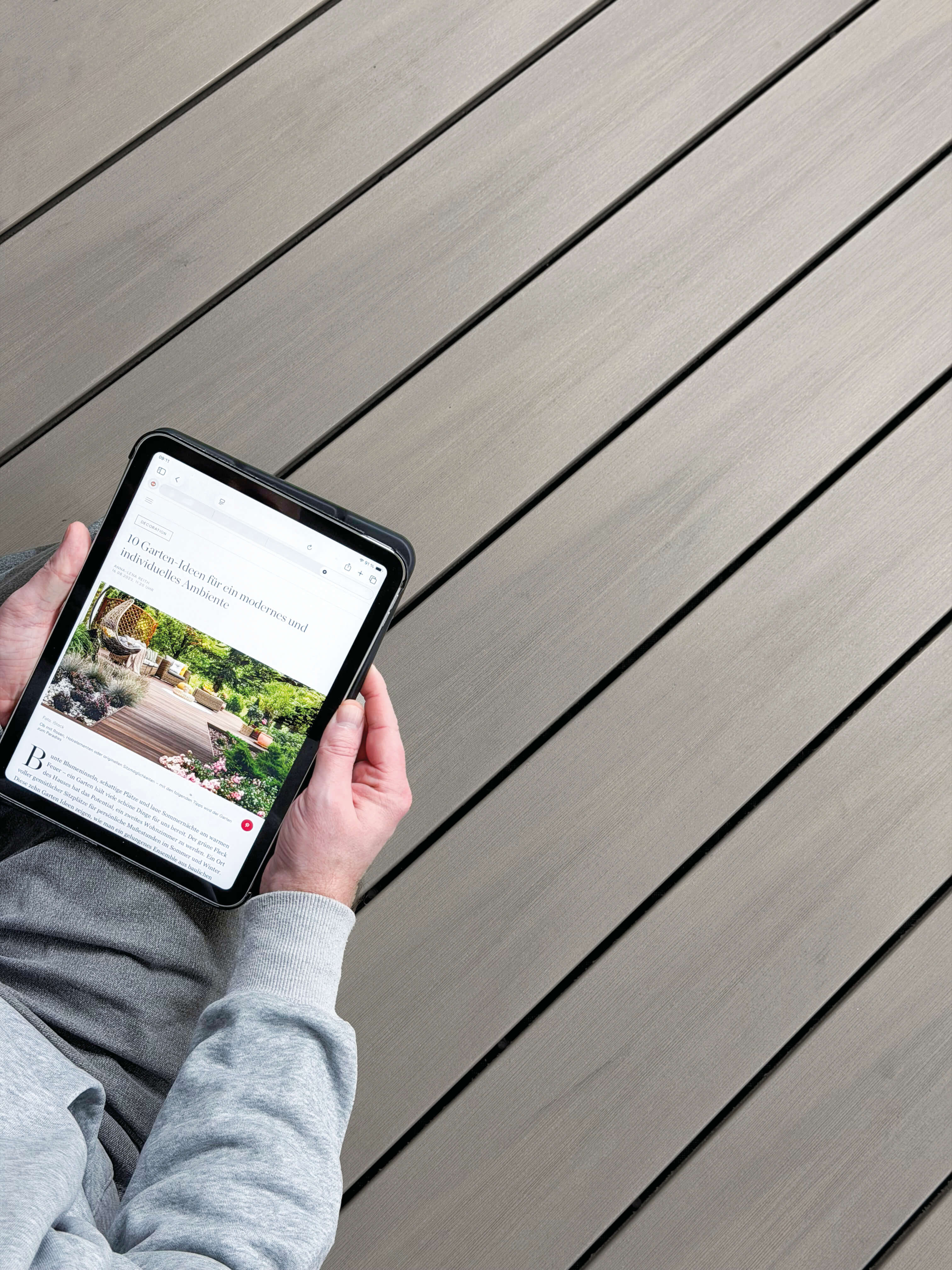 Die gebürstete Oberfläche sorgt für eine angenehme Haptik und verleiht der Diele eine natürliche, elegante Optik. Durch dezente Farbabstufungen entsteht ein harmonisches Erscheinungsbild, das besonders gut zu modernen Außenbereichen passt.